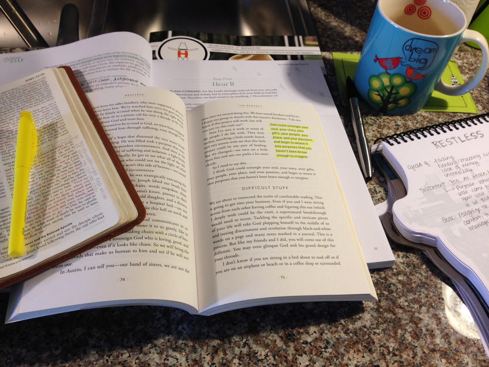 The day is new. We have a fresh start. What better way to start the day than carving out some time to get in the Word, begin your day with truth and still your mind for a few minutes before the rat race begins, the to-do lists set in and the day gets away. I know it seems easy for me to do this, it’s just me I have to worry about in the morning. I can assure you every day from 5:00 – 5:05 this happens…