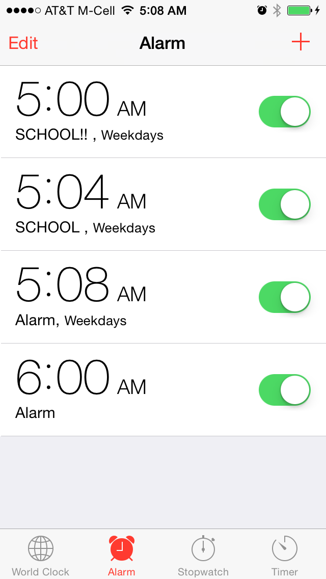 I know myself well enough to know one alarm at 5am isn’t going to wake me up.  So, I have 3 that go off within 8 minutes.  I also know myself well enough that I might turn off those 3 and not realize it, so I have a 6am back up set.