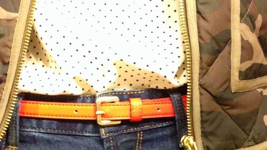 FINALLY…I’ve had this vest since JULY in anticipation of cooler weather!  I know it will be a favorite and go-to for the cooler months here in Texas.  Often a vest adds just enough warmth.  This one is from JCrew Factory.  I paired it with polka-dots and a little safety orange for color pop.  Speaking of Camo…If Jenna Lyons is on record for declaring leopard a neutral, I want to be on record for declaring camo a neutral.