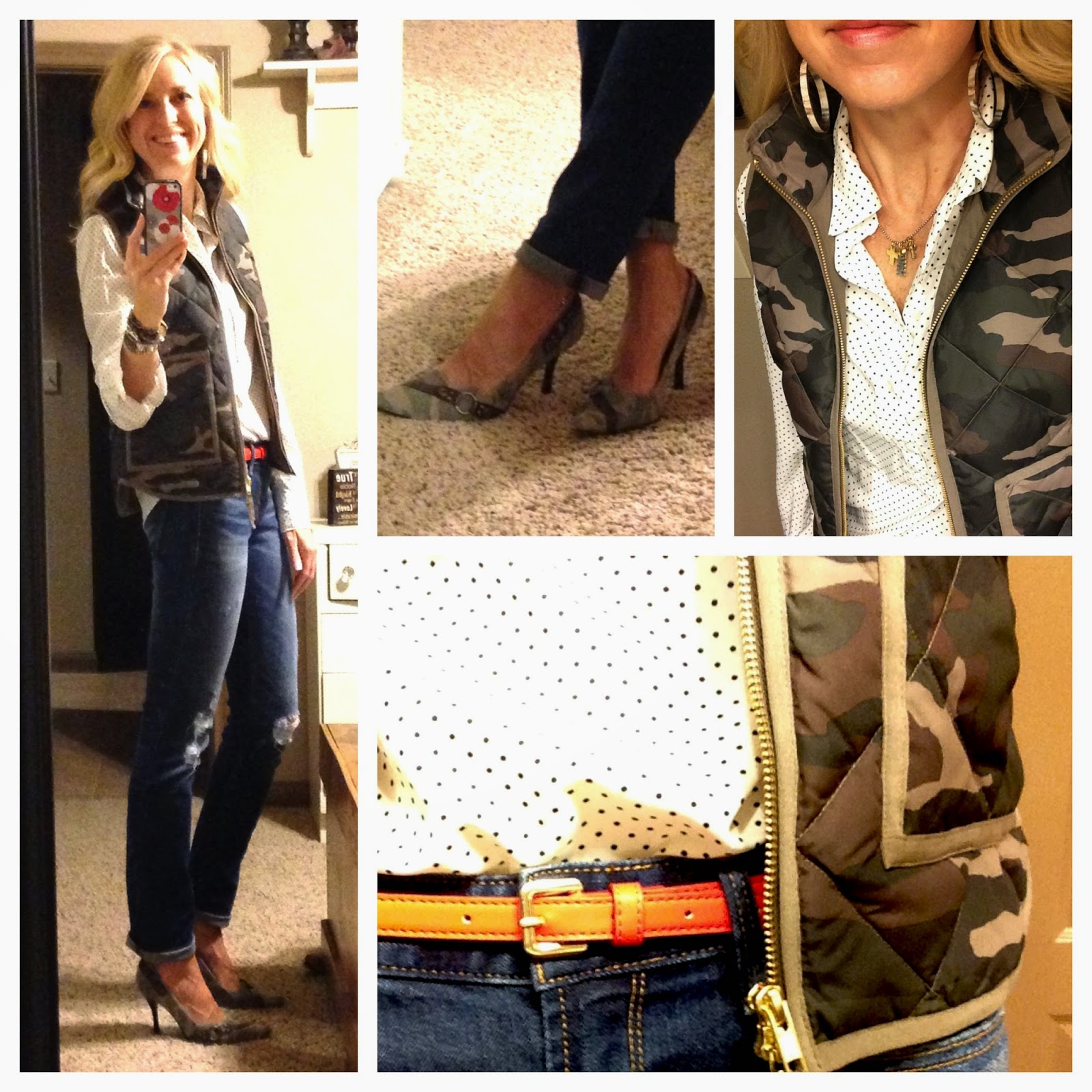 Tuesday…Camo Day…Finally my favorite camo vest I got in JULY!! Since it was camo day I doubled up with my camo shoes too and a little safety orange belt for some color.