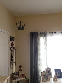 Here’s the window view, my curtains are layered, gray, print and sheers. There’s lots of sunlight into my bedroom like the living room. The hanging crown was a gift from a friend and my dresser holds heirloom family photos in a variety of black and white antiqued frames.